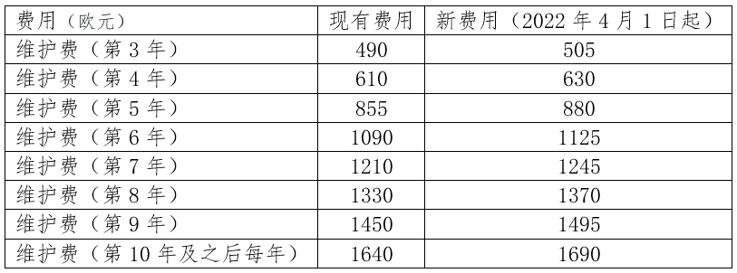歐洲專利的維護(hù)費(fèi)可在到期日前3個(gè)月內(nèi)支付(第3年的維護(hù)費(fèi)為到期前6個(gè)月內(nèi))。因此,本應(yīng)在2022630日或之前繳納維護(hù)費(fèi)的申請(qǐng)人(第3年維護(hù)費(fèi)的到期日為2022930日)可考慮在歐洲專利局費(fèi)用增加生效之前支付維護(hù)費(fèi)是否有益。維護(hù)費(fèi)用的變化如下: