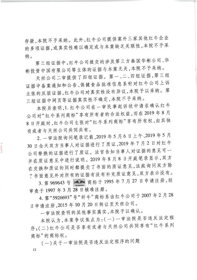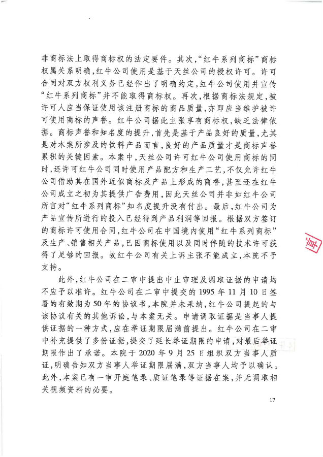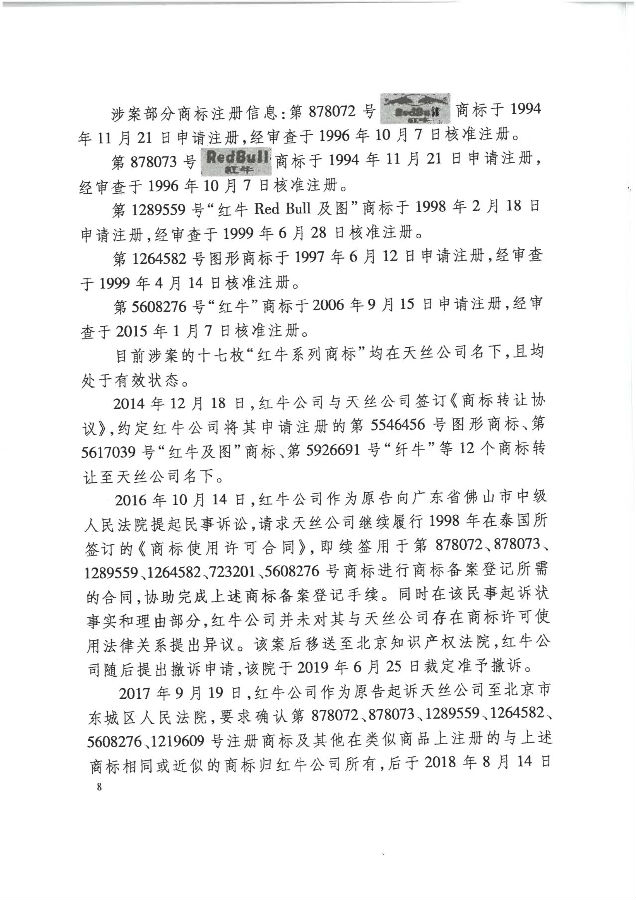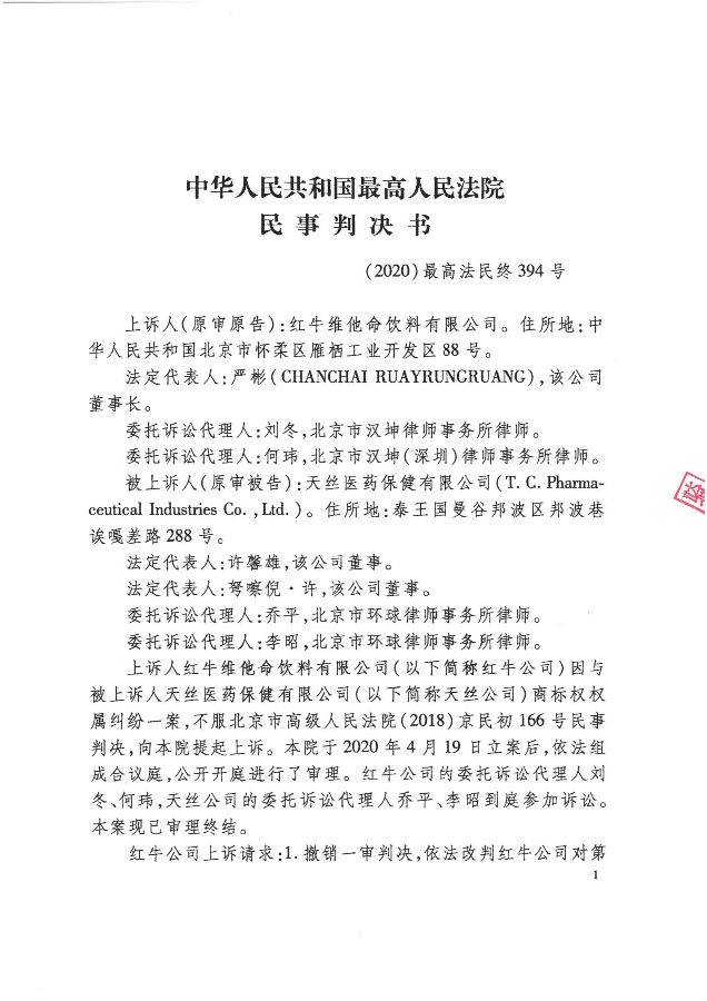 此前,中華人民共和國最高人民法院(下稱“最高法”)已于2020年12月21日作出終審判決【(2020)最高法民終394號】,對中國紅牛有關紅牛系列商標權利歸屬權主張的相關上訴請求予以駁回,維持了一審原判中針對中國紅牛依法享有紅牛系列商標所有者的合法權益“不予支持”的判決結果,并認定了紅牛系列商標歸屬于泰國天絲的事實。