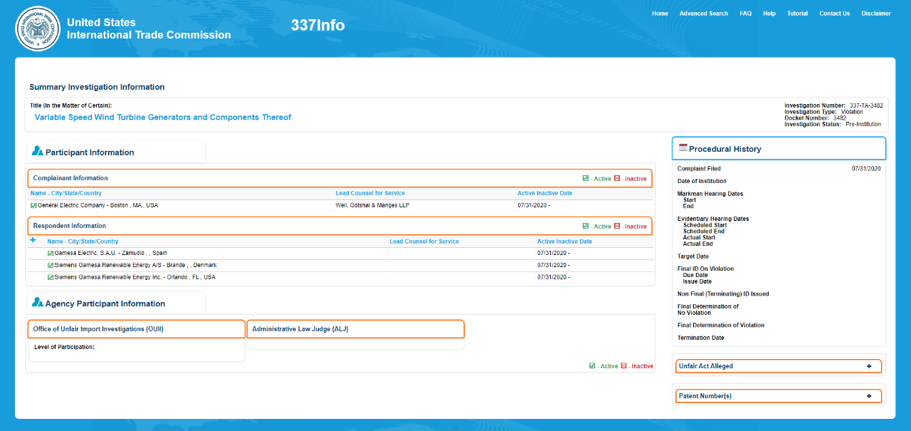 根據(jù)美國(guó)國(guó)際貿(mào)易委員會(huì)(ITC)官網(wǎng)發(fā)布的消息(337-TA-3482),通用電氣公司(GE)于2020年7月31日在ITC發(fā)起337條款訴訟,狀告西門(mén)子歌美颯(Siemens Gamesa)的“變速風(fēng)力發(fā)電機(jī)及其部件”侵權(quán)GE的兩件美國(guó)發(fā)明專(zhuān)利(US 7629705, US 6921985)。這是GE在風(fēng)電領(lǐng)域發(fā)起的又一波重大專(zhuān)利訴訟!
