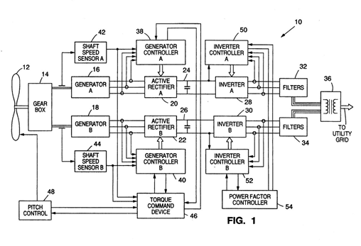 985專(zhuān)利于2005年7月26日獲得授權(quán),名稱(chēng)為:“低壓穿越風(fēng)力渦輪發(fā)電機(jī)(Low Voltage Ride Through for Wind Turbine Generators)”。該專(zhuān)利技術(shù)使得與配電網(wǎng)連接的風(fēng)力渦輪發(fā)電機(jī)具有低電壓穿越能力,從而在劇烈的電壓波動(dòng)期間保持與電網(wǎng)同步,保護(hù)電力變換器和發(fā)電機(jī)免受損害……