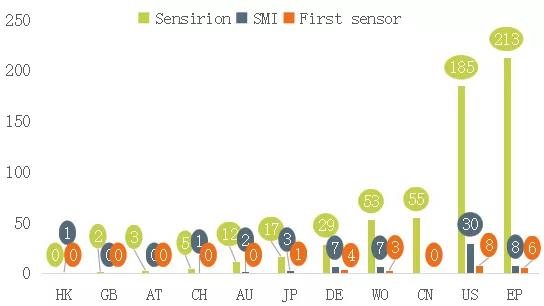 SMI于2002年被瑞思邁并購(gòu)。First sensor為德國(guó)企業(yè),Sensirion為瑞士企業(yè),盛思銳貿(mào)易(深圳)有限公司是SENSIRION的全資子公司,在整個(gè)中國(guó)地區(qū)負(fù)責(zé)SENSIRION產(chǎn)品的銷(xiāo)售和服務(wù)。另,Honeywell為行業(yè)龍頭企業(yè),專(zhuān)利數(shù)量大,本次不作分析。