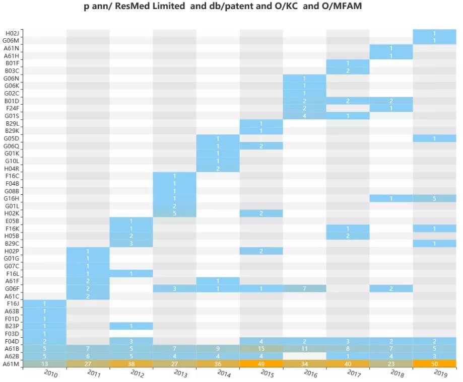從上圖及表中可知,費(fèi)雪派克與瑞思邁間的專(zhuān)利引用交集大,產(chǎn)品技術(shù)重疊度高,競(jìng)爭(zhēng)最為激。怡和嘉業(yè)作為國(guó)內(nèi)企業(yè),可能是因?yàn)橹饕暾?qǐng)?jiān)趪?guó)內(nèi),在審查中很少用到其它同行在先專(zhuān)利申請(qǐng),很少有相互引用的數(shù)據(jù)體現(xiàn)。