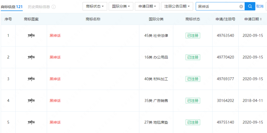 2020年起,游戲開發(fā)團(tuán)隊(duì)的關(guān)聯(lián)公司深圳市游科互動科技有限公司就對“黑神話悟空”、“黑神話”等相關(guān)商標(biāo)進(jìn)行了全類別注冊,甚至注冊了系列以“黑神話”為前綴的商標(biāo),力求全方位無死角的保護(hù)這個核心IP。但值得一提的是,該游戲中玩家扮演的角色“天命人”似乎已被搶注。根據(jù)檢索結(jié)果,2023年12月,自然人王某申請注冊2枚“天命人”商標(biāo),國際分類為廣告銷售、辦公用品。目前,上述商標(biāo)已成功注冊。
